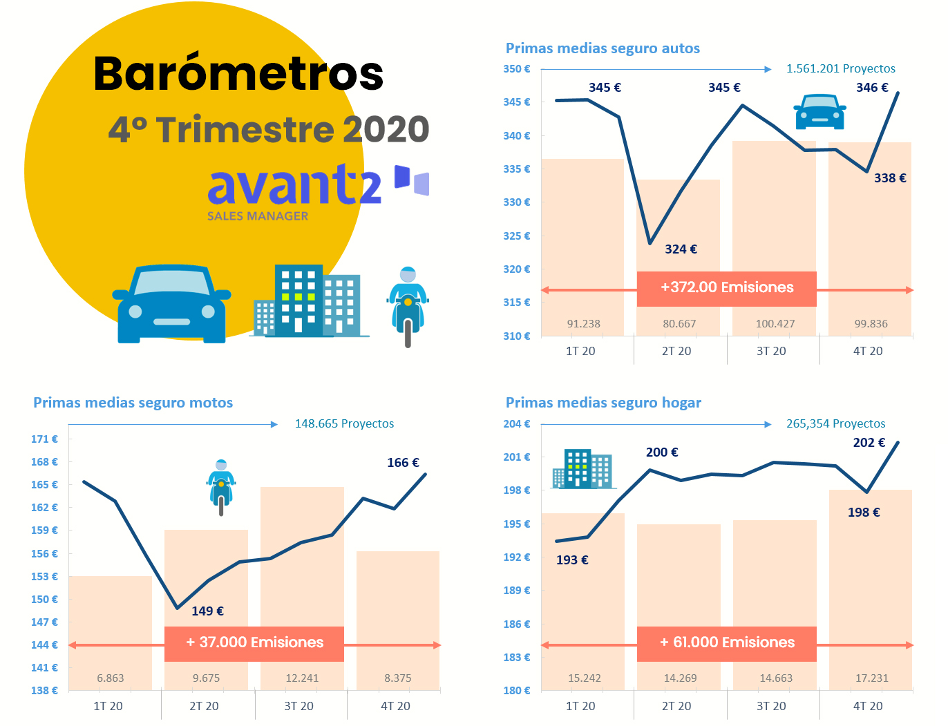 El mes de diciembre siguió marcando una tendencia de mejora en la producción de seguros. El último Barómetro de Avant2 de Codeoscopic correspondiente al cuarto trimestre del año destaca en este mes se contabilizaron las primas medias más elevadas de todo el año, tanto en el ramo de Autos, como de Hogar y Motos.