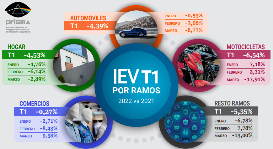 Motos, Hogar, Comercios, Resto de ramos) con únicamente 3 meses en positivo. El mayor aumento en nueva producción se produjo en marzo para el ramo de Comercio al superar en casi un 10% los datos de un año antes. Por el lado contrario, el peor fue marzo también, para los seguros de Motos al caer en su comparación con el mismo periodo del año anterior un 18%.