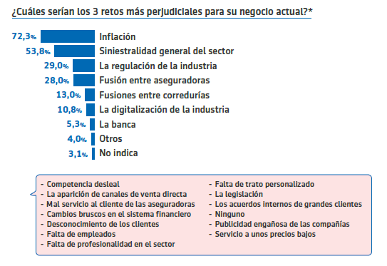 Aegon ha elaborado el 'I Informe del corredor de seguros en España: perspectivas, digitalización y retos', del que se extraen diversas conclusiones. Comenzando por los retos, la inflación se presenta como el principal obstáculo al que tienen que hacer frente los mediadores de cara al desarrollo de su negocio, según el 72,3% de encuestados. El segundo desafío que más les puede perjudicar es la siniestralidad general del sector, como reconoce el 53,2% de los mediadores entrevistados. Detrás aparecen la regulación de la industria (29%) y la fusión entre aseguradoras (28%).