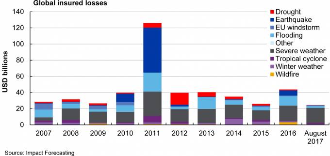 El informe revela que las grandes reaseguradoras continúan presentando sólidos resultados en la primera mitad de 2017, gracias a un comportamiento relativamente favorable de la siniestralidad y a unos rendimientos de las inversiones estables. En este entorno de mercado favorable también destaca el aumento de capital alternativo y su impacto en la competencia en las renovaciones de mediados de año. Según cifras preliminares y anteriores al huracán Harvey, las pérdidas aseguradas en los 8 primeros meses de 2017 ascendían a un total de 4.500 millones de dólares, representado el 56% de la media de los últimos 10 años para el mismo periodo. El porcentaje reasegurado de estas pérdidas era bajo, dado que una gran proporción de las mismas correspondía a eventos climáticos localizados en EEUU.