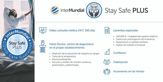 Éstas son algunas de las coberturas y servicios que incluye el producto Stay Safe Plus de InterMundial: videoconsulta médica durante las 24 horas del día; Servicio Hotel Doctor; con el que los hoteles contarán con un equipo de diagnóstico online en el propio establecimiento; hasta 100.000 euros por huésped para gastos médicos y de hospitalización derivados de contagio por Covid-19; repatriación o traslado sanitario por contagio de Covid-19 para el asegurado y sus acompañantes; y gastos por prolongación de la estancia en el hotel por situación de cuarentena o por hospitalización del huésped o sus acompañantes por causa de contagio. Además, InterMundial entregará un sello distintivo a los establecimientos turísticos que contraten Stay Safe Plus.