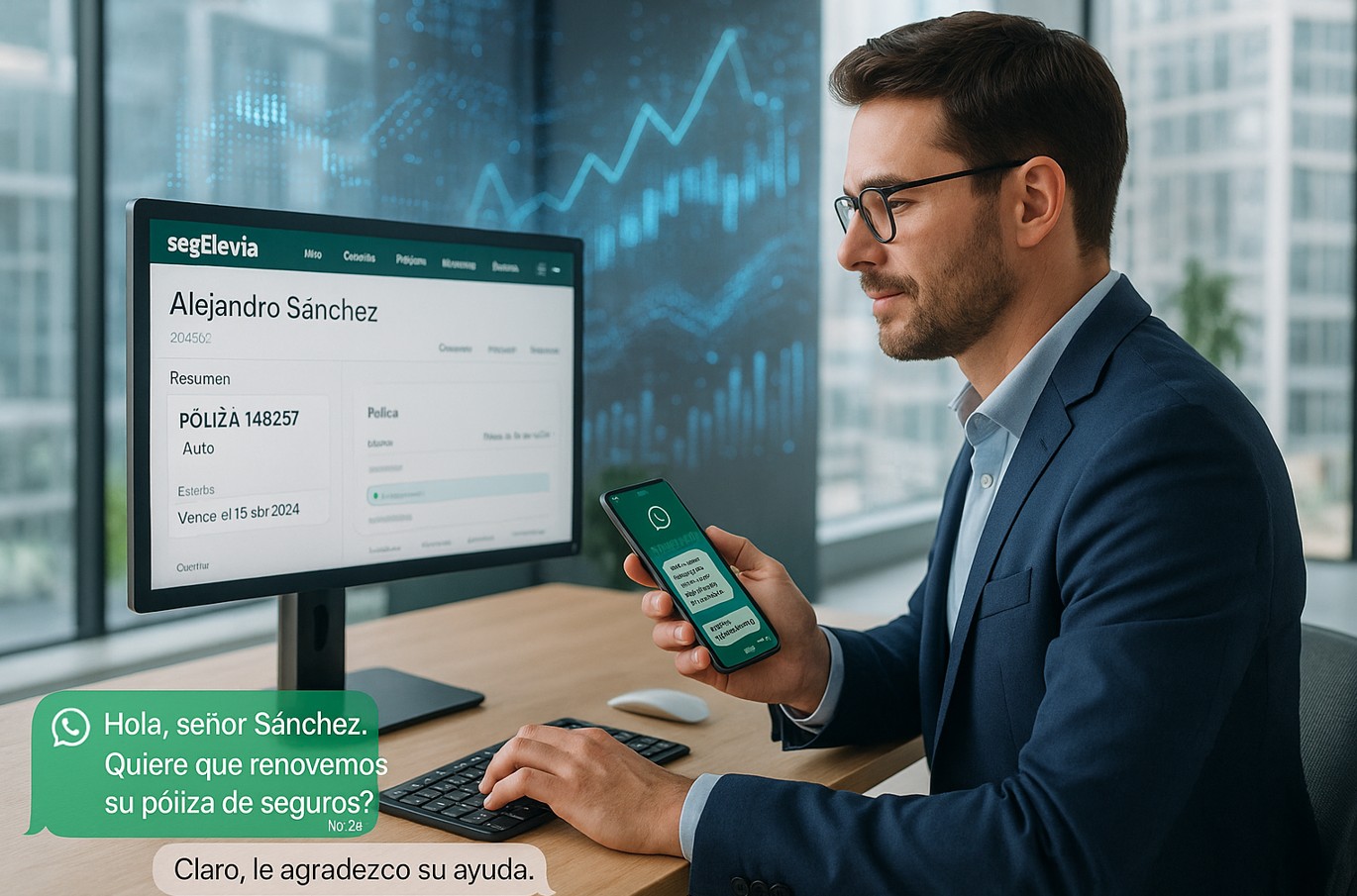 ¿Y qué decir de su conexión con WhatsApp? Más que una ventaja, es una necesidad hecha realidad. La mayoría de los asegurados ya utilizan esta aplicación a diario; integrarla en la atención significa acercarse aún más a su lenguaje y sus costumbres. Consultar el estado de una póliza, recibir un PDF o reportar un siniestro deja de ser una tarea pesada para convertirse en una conversación natural. Para la correduría, además, supone reducir llamadas, evitar duplicidades y centralizar toda la información directamente en SegElevia, lo que aporta orden, trazabilidad y eficiencia.
