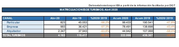 El canal más afectado es el de particulares, que solo registra 823 entregas al tener totalmente limitadas las actividades de venta física, cayendo las ventas un 98,2%. Las empresas también reducen radicalmente sus entregas en un 97,3%, contabilizándose 993 matriculaciones, y el canal de alquiladores desciende un 93,8% con 2.347 unidades.