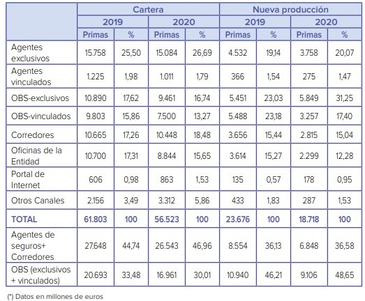 Según consta en el Informe del Sector elaborado por la DGSFP, y que acaba de hacer público en su web, el seguro español recaudó 56.523 millones de euros en 2020. De este total, agentes y corredores intermediaron 26.543 millones; es decir, el 46,96% de la facturación total. Por su parte, los OBS aportaron 16.961 millones a la recaudación, representando el 30,01% del negocio.