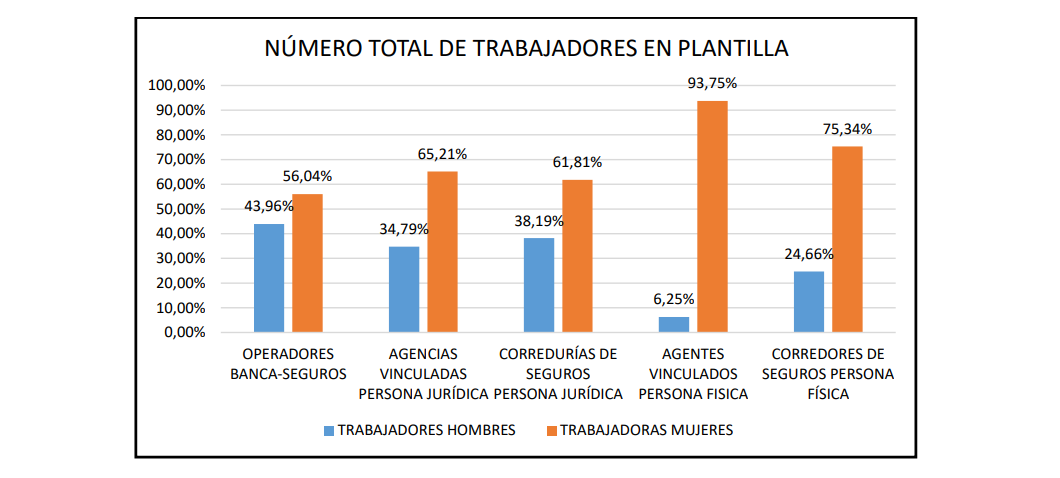 En todas las tipologías de mediadores de seguros la presencia de las mujeres es muy superior a la de los trabajadores hombres, registrándose las mayores diferencias en el caso de los corredores de seguros personas físicas y los agentes vinculados personas físicas. Es una de las principales conclusiones de la encuesta de género realizada por la DGSFP, que sitúa en un 61,81% el porcentaje de mujeres en corredurías personas jurídicas por un 38,19% de hombres, que en el caso de corredores personas físicas pasa a ser del 75,34% de mujeres por un 24,66% de hombres. Esa diferencia es más abultada entre agentes vinculados persona física, con un 93,75% de mujeres y un 6,25% de hombres, ajustándose algo más entre agencias vinculadas persona jurídica con un 65,21% mujeres y un 34,79% hombres. Y entre operadores de bancaseguros, el 56,04% son mujeres y el 43,96% hombres.
