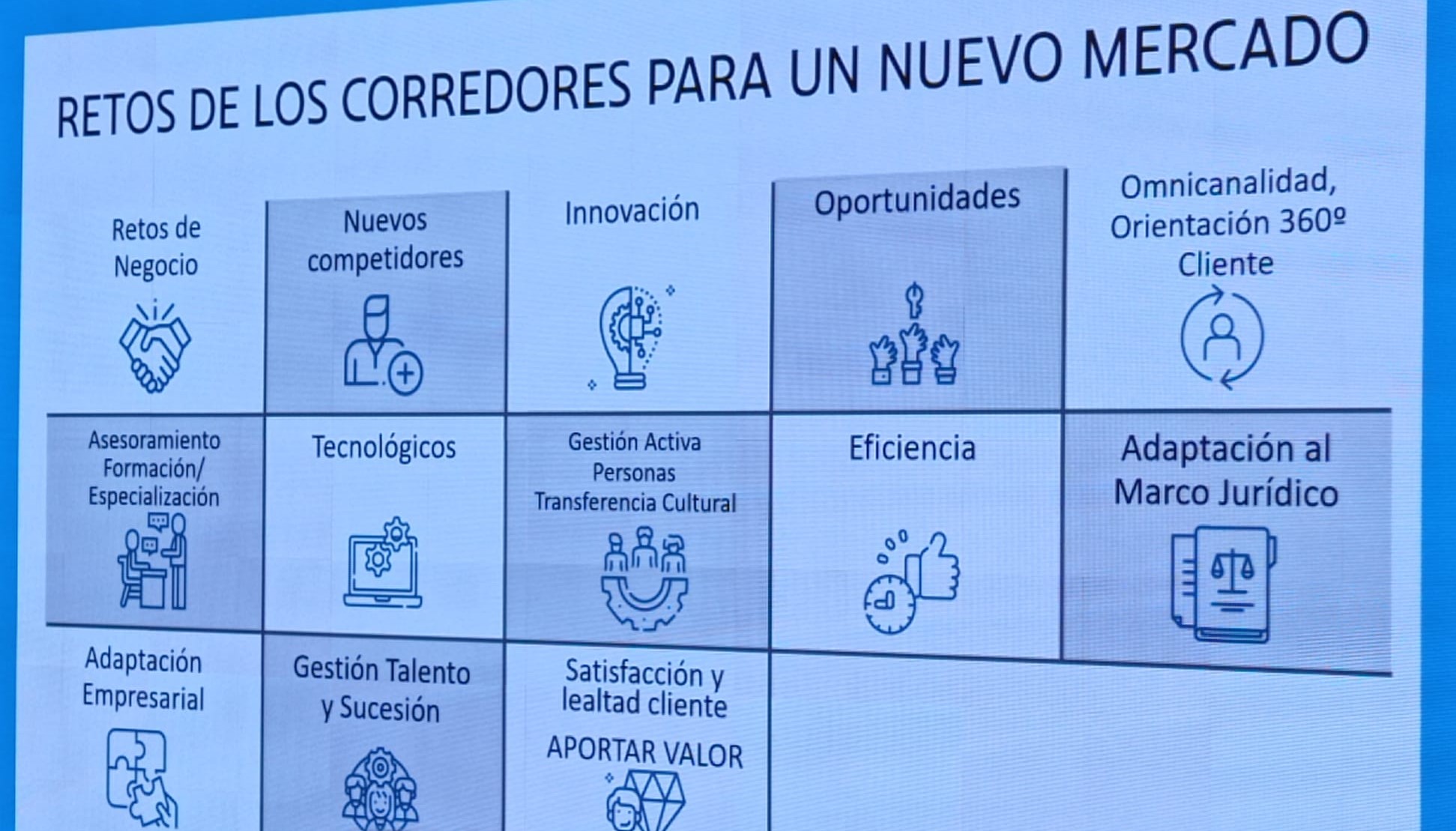 La primera de ellas abarca todos los retos que tienen que ver con el negocio. Para Jessica Palma, de la Correduría Palma e Hijos de Sabadell (Barcelona), "crecer" es el mayor "reto y propósito" que tiene esta empresa de mediación de carácter familiar. Y Serafín Trápaga, gerente de Aseguras (Asesores de Seguros de Santander), empresa ubicada en la capital de Cantabria, señala otro reto relacionado: "Buscar la rentabilidad del negocio". Estos son dos ejemplos de retos vinculados con el negocio y que son unánimes en todas las corredurías.