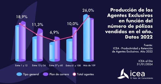 Y si no se hace distinción por tipología, de ese 73% de agentes exclusivos que al menos distribuyeron una póliza, un 26% fueron más allá e intermediaron más de 109.