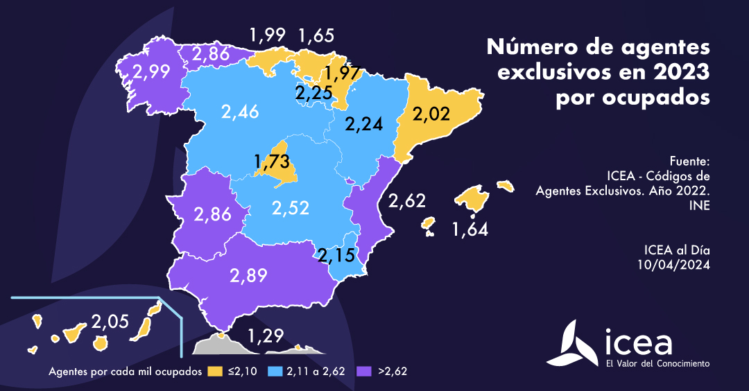 Galicia, Andalucía, Extremadura y Asturias fueron las comunidades autónomas donde más personas operan como agentes exclusivos por cada 1.000 ocupados a finales de 2023, según los datos de ICEA. En toda España,, cifra que superaron esa comunidades con 3 agentes por cada 1.000 ocupados.