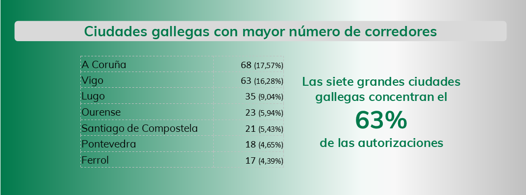 El informe explica que la mayoría de los corredores se ubican en las grandes ciudades gallegas aglutinando el 63% de esos