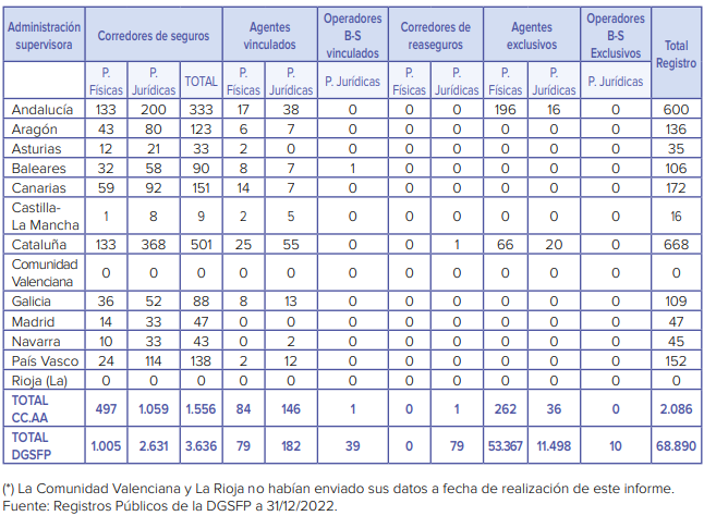 De los 70.976 mediadores inscritos en España, 68.890 estaban bajo el control de la DGSFP. Aquí la novedad es que apenas ha variado la cifra en un año, solamente se han dado de baja 20 profesionales de diciembre de 2021 a diciembre de 2022. Y los 2.086 mediadores restantes se encontraban inscritos en los registros de las CCAA, reduciéndose un 7,62%. Si bien cabe recordar que, como es habitual, la Comunidad Valenciana y La Rioja no habían enviado sus datos a fecha de realización de este informe.