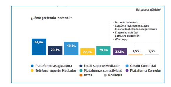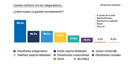 seguros. Y de manera especial son las elegidas en cuestiones globales, gestiones de siniestros, ventas y emisiones de nuevas pólizas y suplementos y tareas administrativas. Como segunda plataforma preferida por la red de mediación aparece el contacto con el gestor comercial; también gana adeptos en el uso de plataformas de conectividad que adelanta al contacto telefónico.