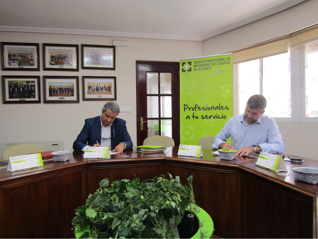 El acuerdo firmado entre Javier Carratalá, director de la sucursal de Plus Ultra Seguros de Alicante, y Eusebio Climent, presidente del Colegio, contempla el apoyo y la presencia de la aseguradora en los seminarios y conferencias que el Colegio organice.