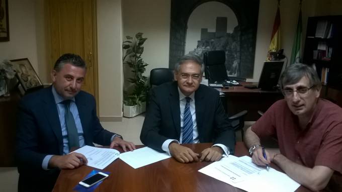 La firma del convenio fue presidida por José Luis Martínez, presidente del Colegio; Alberto Bartolomé, director de zona de Andalucía Oriental y Murcia de la red de corredores de Plus Ultra, y José María López, director de zona de Andalucía red agencial.