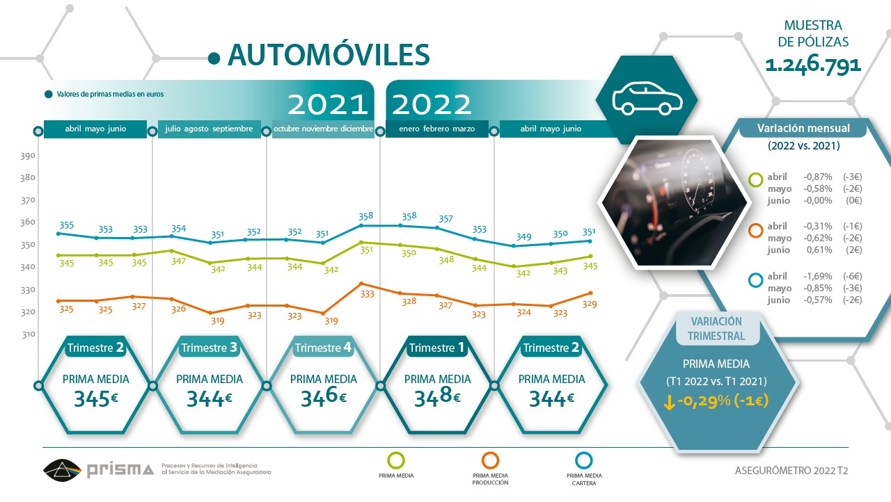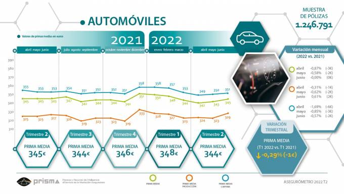 El precio del seguro de Autos en el canal corredores se sitúa en 344 euros de prima media general y en 325 euros para la nueva producción, que representa un decremento del 0,30% respecto al segundo trimestre de 2021, en contraposición al incremento del 3,34% que se ha observado en los seguros directos publicados en los comparadores.
