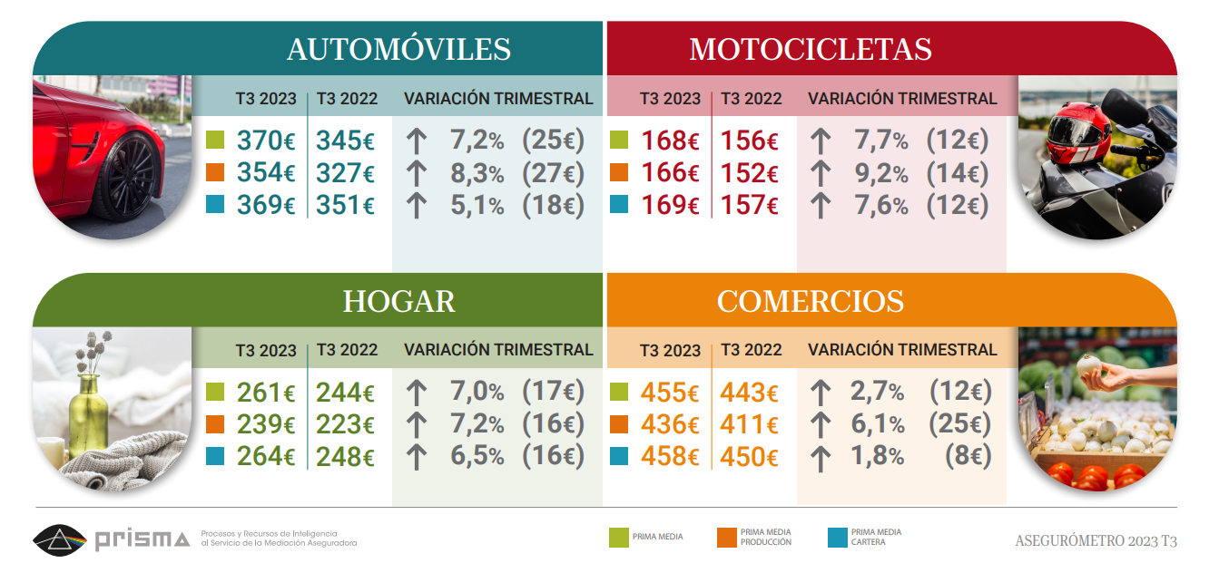 Prisma concluye el análisis señalando que los precios medios del seguro "han experimentado una subida progresiva a lo largo del 2023 en todos los ramos analizados". Apunta que se confirma así en lo que llevamos de año subidas de primas medias entre el 2,7% de Comercios y hasta el 7,7% en Motocicletas.