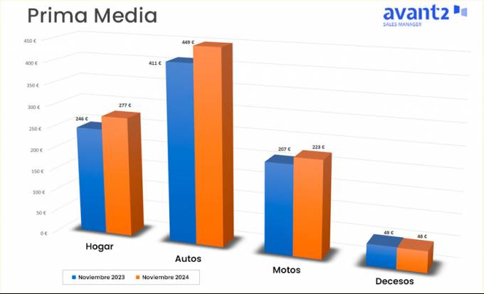 Según los datos de Avant2 Sales Manager, en noviembre se mantuvo el aumento de la prima media interanual en varios ramos. En Hogar, en nueva producción, la prima media aumentó un 12%, con la modalidad 'Premium' por encima del 20%. En Autos, fue del 9%, alcanzando una prima media de 449 euros, y en Motos subió un 7%. En cuanto a Decesos, el valor de la prima media de nueva producción se situó en 48 euros, un 3% menos. Y en Salud, el incremento fue del 13%, para cerrar noviembre en 1.367 euros.
