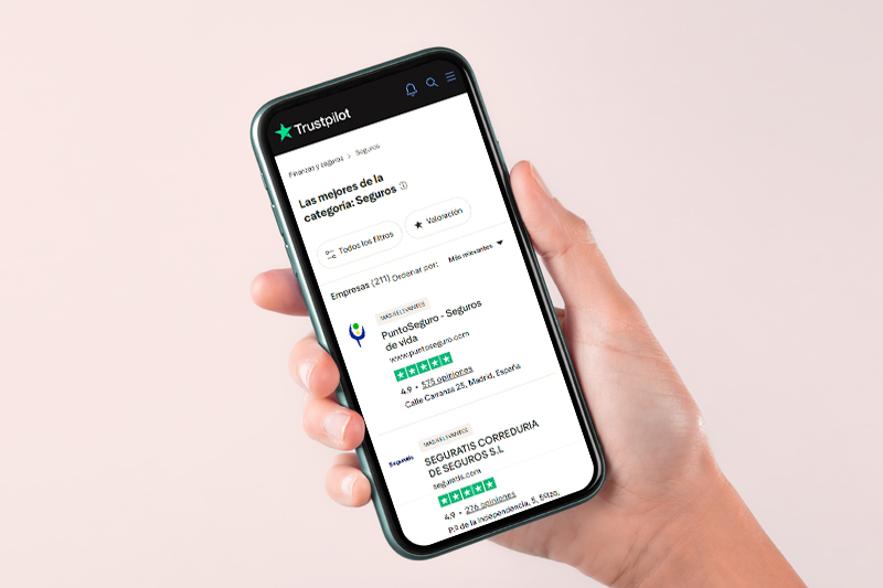 La plataforma Trustpilot ha reconocido a PuntoSeguro por su seguro de Vida en función de las reseñas de clientes, tras alcanzar la primera posición en la categoría de seguros. "Con una puntuación de 4,9 sobre 5 y más de 575 opiniones verificadas, PuntoSeguro lidera el ranking asegurador por delante de 210 dominios registrados en España, que incluyen a la mayoría de aseguradoras, corredurías y agencias de suscripción relevantes en internet", afirma.
