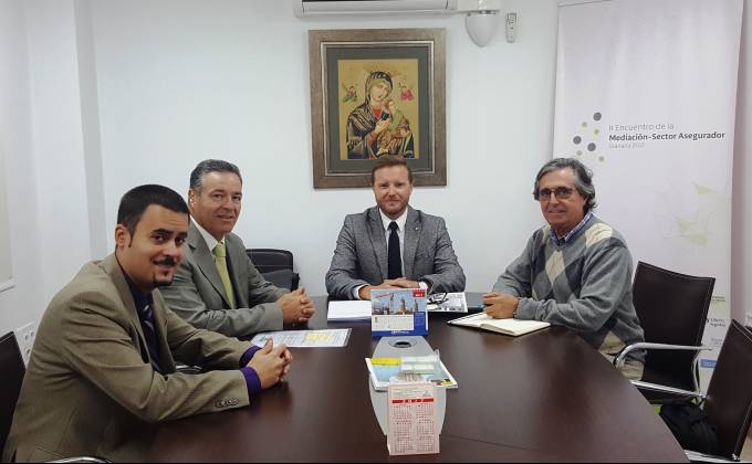 El presidente del Colegio de Granada, Genaro Sánchez, acompañado del vicepresidente de la institución, Enrique J. Pérez, recibieron al director Sucursal de Granada de Preventiva, Rafael Marín y al inspector comercial Jose Antonio Carmona.