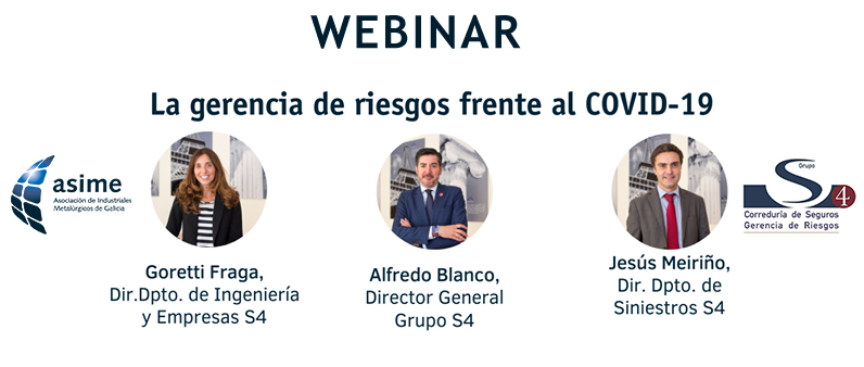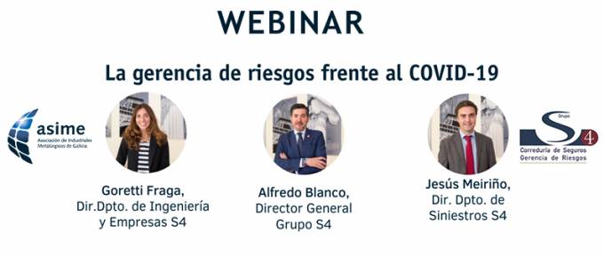 El Grupo S4, en colaboración con Asime (Asociación de Industriales Metalúrgicos de Galicia) y el IDE (Instituto de Desarrollo Industrial), ha impartido el webinar 'La gerencia de riesgos frente al Covid-19', enfocado en los seguros de RC Patronal y D&O.