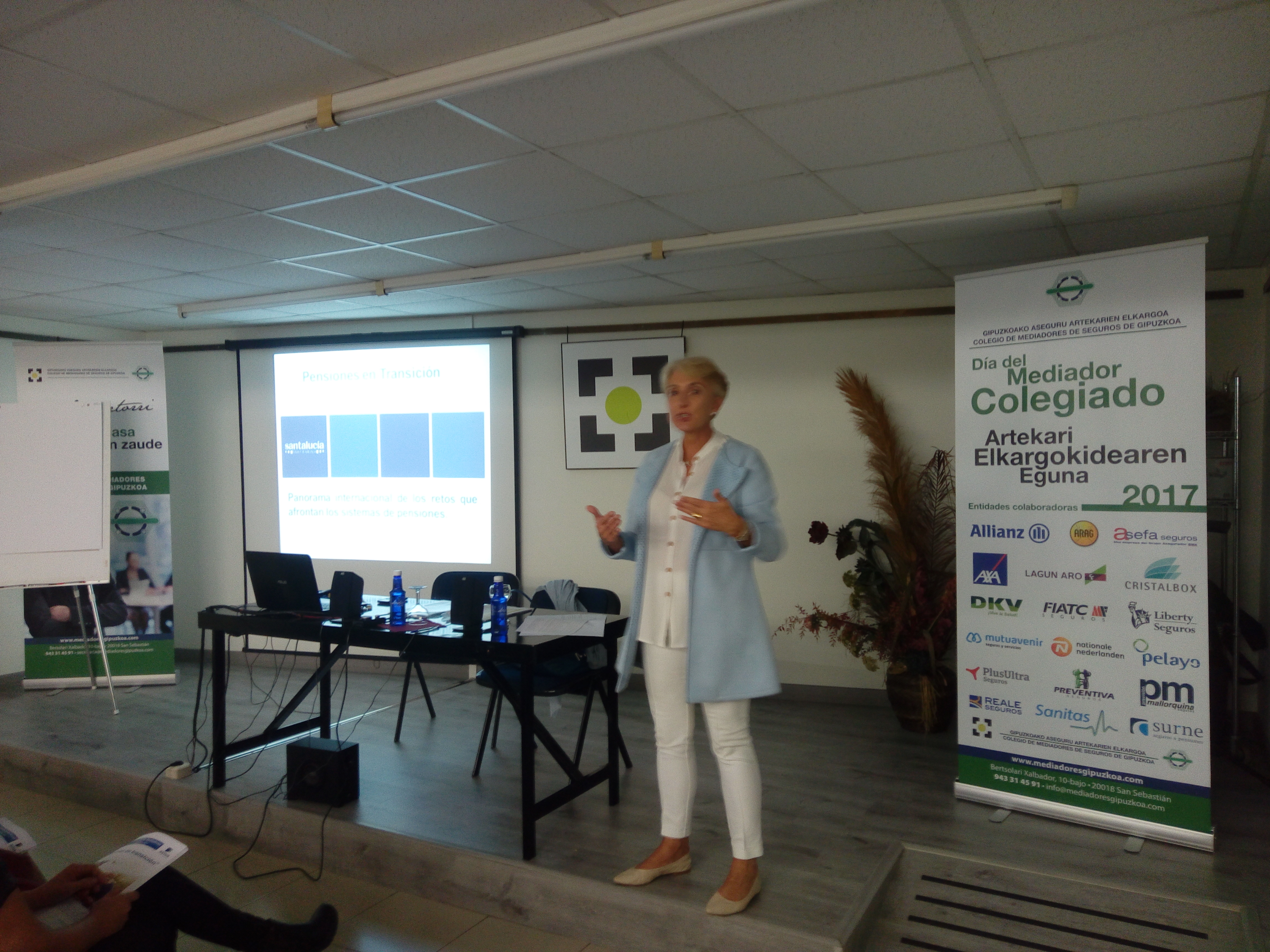 santalucía ha llevado a cabo una jornada de formación en las instalaciones del Colegio de Guipúzcoa, la cual ha girado en torno al lema 'Pensiones en transición'. La han impartido Maria Eugenia Líbano y Javier López García, responsable de formación comercial de la aseguradora y director territorial para el País Vasco, respectivamente. Ambos han estado acompañados por Koldo Etxeberria, director de la sucursal en Guipúzcoa.