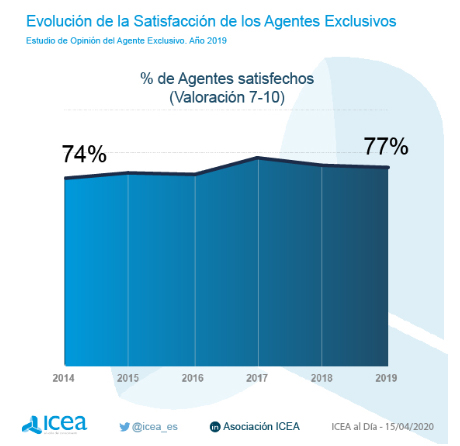 ICEA ha realizado el informe 'Opinión del Agente exclusivo' en el que ha preguntado a 1.200 de estos profesionales sobre su satisfacción con el servicio prestado por parte de su compañía. Según este análisis el grado de satisfacción alcanzaría el 77% en línea con el pasado año y 3 pp mejor que hace cinco años. El mayor grado de satisfacción fue en 2017.