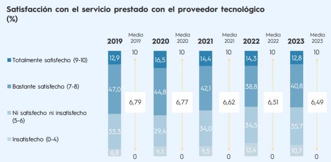 Lo positivo para las tecnológicas es que se reduce en casi 2 puntos el porcentaje de encuestados que otorgan un suspenso al afirmar que se sienten "insatisfechos". En esta última edición, se queda en un 10,7%. Si bien todavía queda lejos el 6,8% de 2019.
