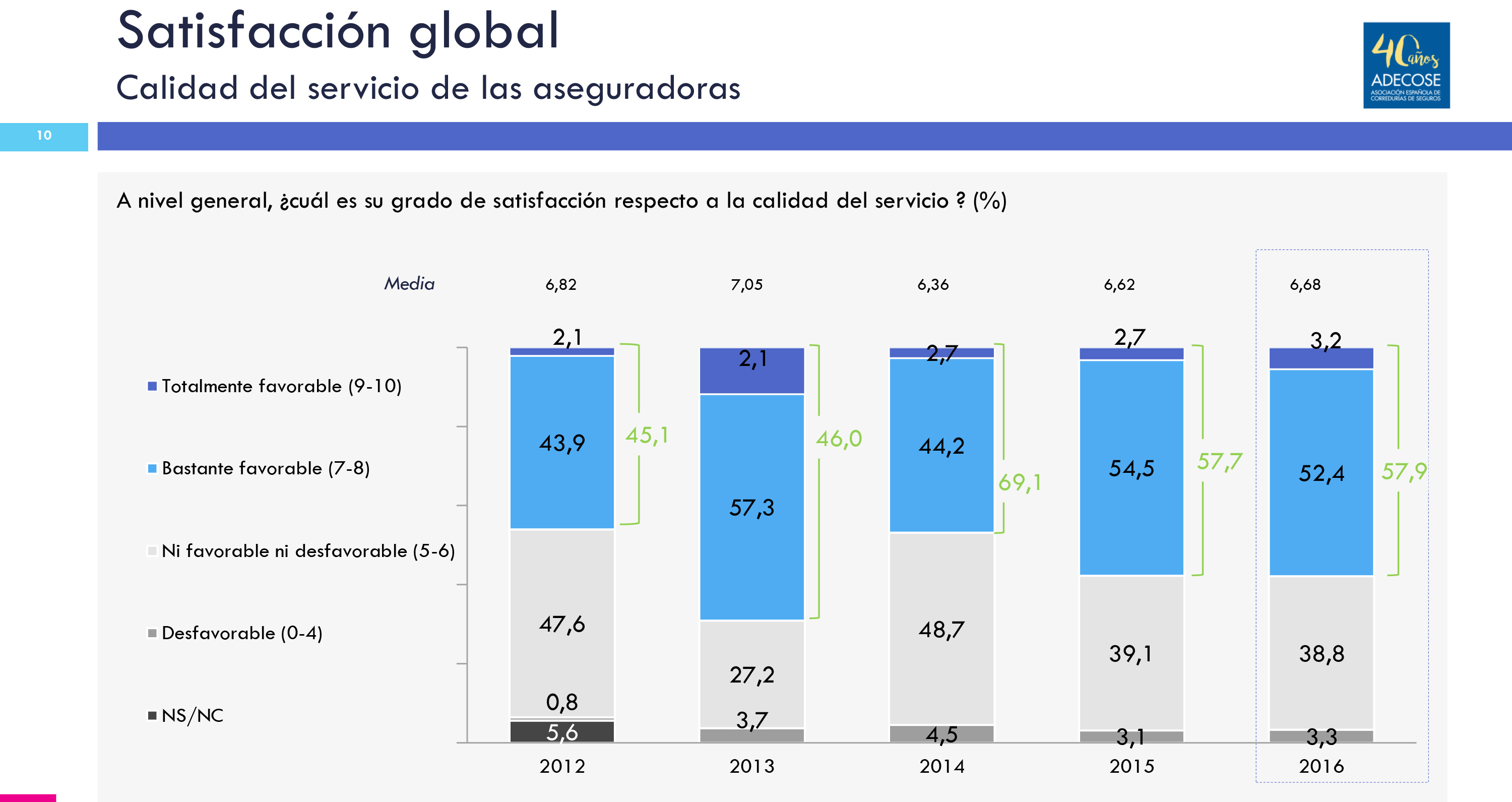 La nota media que otorgan los socios de Adecose a las aseguradoras es de 6,68, por encima del 6,62 otorgado en la anterior edición. Aunque el dato se mantiene lejos del 7,05 de nota media que les concedieron en 2013, en el VIII Barómetro Adecose sobre la calidad del servicio se detecta un progresivo avance en la satisfacción de las corredurías que han cumplimentado las encuestas. Sin embargo, la gestión de los siniestros es la asignatura pendiente un año más.
