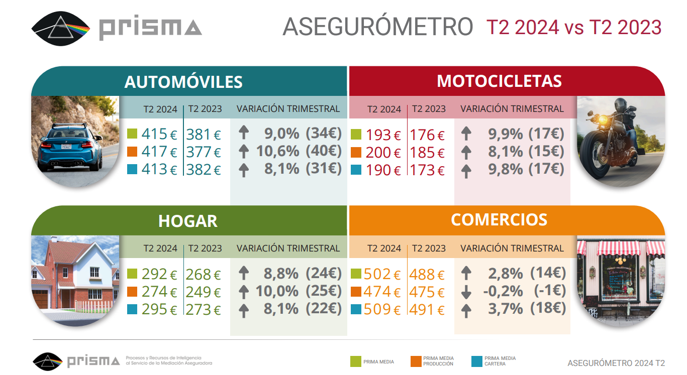 La prima medida de Autos en el segundo trimestre del año modera su subida. Según los datos de Prisma a través de su Asegurómetro del 2T dentro del canal corredores, los precios son parecidos a los de los 3 primeros meses del año, con ligeras subidas. Según estos datos, la prima media crece en 5 euros al pasar de 410 a 415; para las renovaciones de cartera el