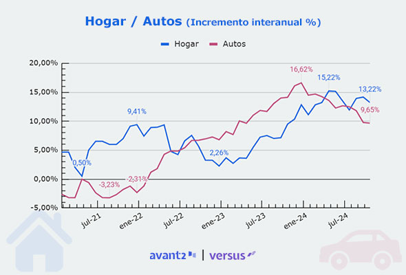 Como datos a tener en cuenta es que al comienzo del estudio el crecimiento interanual de la prima media de Autos partía de una posición negativa mientras que la de Hogar se acercaba al 5%. Autos alcanzó su punto máximo en diciembre de 2023 superando el 16%. Mientras que el punto álgido de Hogar llegó en abril de 2024 al 15% de aumento.