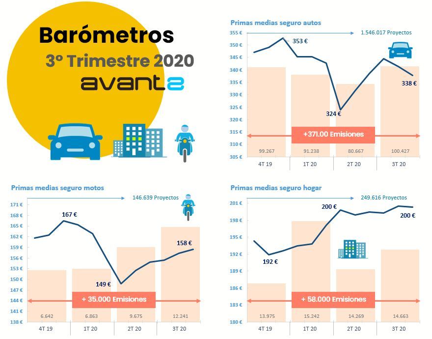 El multitarificador Avant2 de Codeoscopic ha presentado los datos de su barómetro al cierre del tercer trimestre del año donde destaca que "todos los ramos han recuperado en estos meses el nivel de emisiones previo al estado de alarma decretado en marzo". Añade que sucede esto "a pesar incluso de la caída estacional de actividad que siempre refleja el mes de agosto". Explica que la excepcionalidad en este año queda marcada por la situación de que en abril se emitieron menos pólizas de Autos y motocicletas que en agosto.