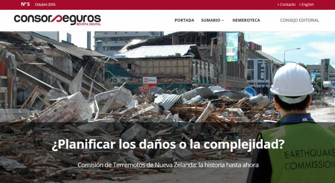 El número de octubre de la revista del Consorcio de Compensación de Seguros (CCS) Consorsegurosdigital.com se pregunta sobre planificar los daños y su complejidad ante casos de terremotos con la firma de varios profesionales neozelandeses. Además, analiza distintos aspectos sobre el riesgo de inundación o el nivel de cobertura de riesgos de las empresas españolas en su actividad en el exterior.