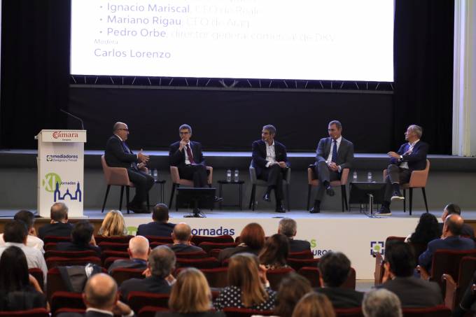 El CEO de Zurich, Vicente Cancio; de Reale, Ignacio Mariscal; de Arag, Mariano Rigau, y el director general de DKV, Pedro Orbe han compartido mesa de debate en las XI Jornadas Técnico-Formativas organizadas por los Colegios de Mediadores de Seguros de Zaragoza y Teruel y en las que abordaron temas como la economía, la mediación y la tecnología.