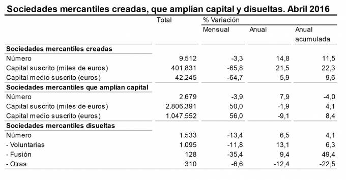 La cifra total de empresas creadas en abril fue de 9.512 sociedades, el 14,8% más que en el mismo mes de 2015, mientras el número de disoluciones fue de 1.533, un 6,5% más, según el INE. Entre las sociedades mercantiles creadas, el capital suscrito para su constitución superó los 401 millones de euros (+21,5%), con un capital medio suscrito de 42.245 euros (+5,9%).