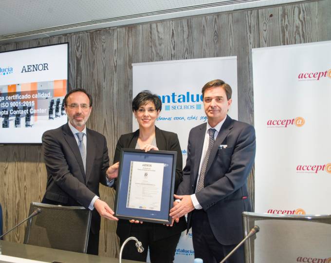 Accepta Servicios Integrales, compañía de servicios de gestión de relaciones con clientes y contact center de Grupo Santalucía, ha obtenido la certificación de calidad ISO 9001 por parte de Aenor. Andrés Romero, director general de Santalucía, ha sido el encargado de recoger este certificado de manos de Gonzalo Piédrola, director de Aenor para la Región Centro y Europa, en un acto celebrado, en 25 de enero, en la sede social de Santalucía, en el que también han intervenido la directora de Accepta Contact Center, Ana Isabel Queipo, y la directora de Comunicación y RSC del grupo, Emma Marín.