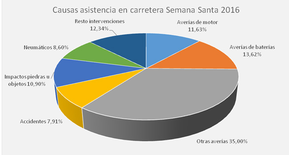 Según el Observatorio de Siniestros de Asitur, en base a los datos de la compañía en esta Semana Santa, la asistencia en carretera por accidentes ha supuesto un 22,6% más que la media del resto del año. Por el contrario, las asistencias relacionadas con las averías del vehículo han caído un 2,5% respecto al resto del año. Dentro de estas últimas, las baterías (23% de los casos) han liderado las asistencias, seguida de los problemas de moto (19) y los neumáticos (7,2%). Otras causas habituales como la pérdida de llaves o problemas con el combustible no han variado su frecuencia.