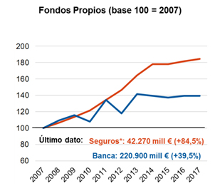 Respecto a los fondos propios, en ambos sectores se han incrementado, más en seguros (85% frente a 40%). AFI explica que en seguros este incremento se ha producido a partir de unos sólidos resultados, mientras que "en el caso de la banca se ha producido vía fuertes inyecciones de capital, tanto privado como fundamentalmente público. Los fondos propios de la banca en 2017 escalan unas cinco veces los de las compañías de seguro".