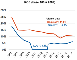 En el caso de los resultados netos, AFI destaca la "gran estabilidad" en el negocio de seguros, y "el fuerte deterioro y la volatilidad de los resultados" en el de la banca. Como combinación del comportamiento de los resultados y los fondos propios, el ROE ha mostrado en los dos casos un perfil decreciente, y en el caso de la banca, muy volátil. Depuradas las cifras de las pérdidas de Popular, el ROE de la banca (por sus negocios en España) no llegaría al 6% frente al 11% de las compañías de seguros.