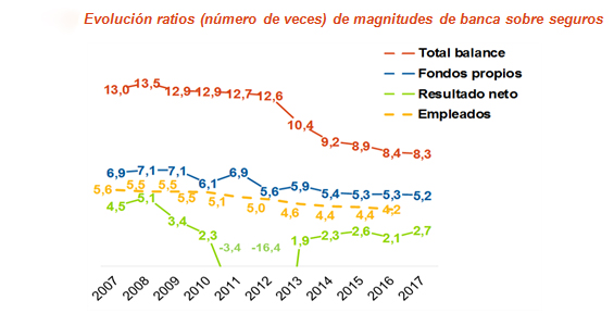 En 2017, el balance agregado de las compañías aseguradoras creció un 41% respecto a 2007, el año previo a la crisis. Por su parte, la caída del balance agregado de los bancos se ha frenado por primera vez en los últimos años, y su tamaño sigue siendo a día de hoy un 10% inferior al de hace una década. Como consecuencia, según el análisis realizado por AFI, "se ha producido una compresión significativa de la brecha original de tamaño existente entre ambos sectores". Los activos de las entidades bancarias con negocio en España serían en 2017 unas ocho veces los de las compañías de seguros.