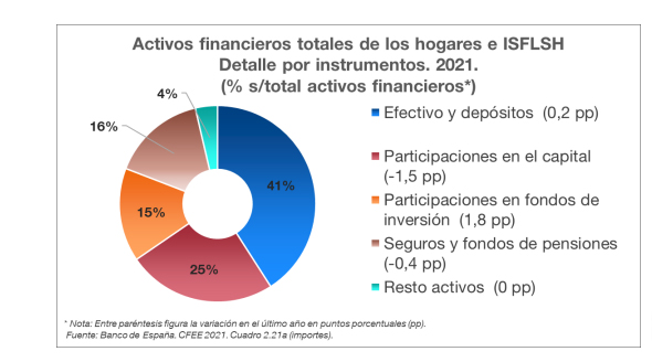 Por componentes de estos activos financieros, su mayor parte, el 41%, se encuentra en efectivo y depósitos, seguido de participaciones en capital (25%), seguros y Fondos de Pensiones (16%) y Fondos de Inversión (15%). Según los datos, el de mayor crecimiento fueron estos últimos con 1,8 pp respecto a un año antes. Los seguros, por su parte, menguaron en 0,4 pp respecto a junio de 2020.