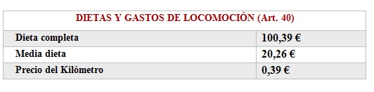La Comisión Mixta del Convenio de Seguros y Mutuas Colaboradoras con la Seguridad Social ha actualizado para el año 2019 los importes correspondientes a las dietas y los gastos de locomoción establecidos en el artículo 40, que son conceptos vinculados a la evolución del IPC, a la evolución del precio de los carburantes y a la evolución del índice de Restauración y del índice de Hoteles. Estos conceptos quedan establecidos en las siguientes cuantías: