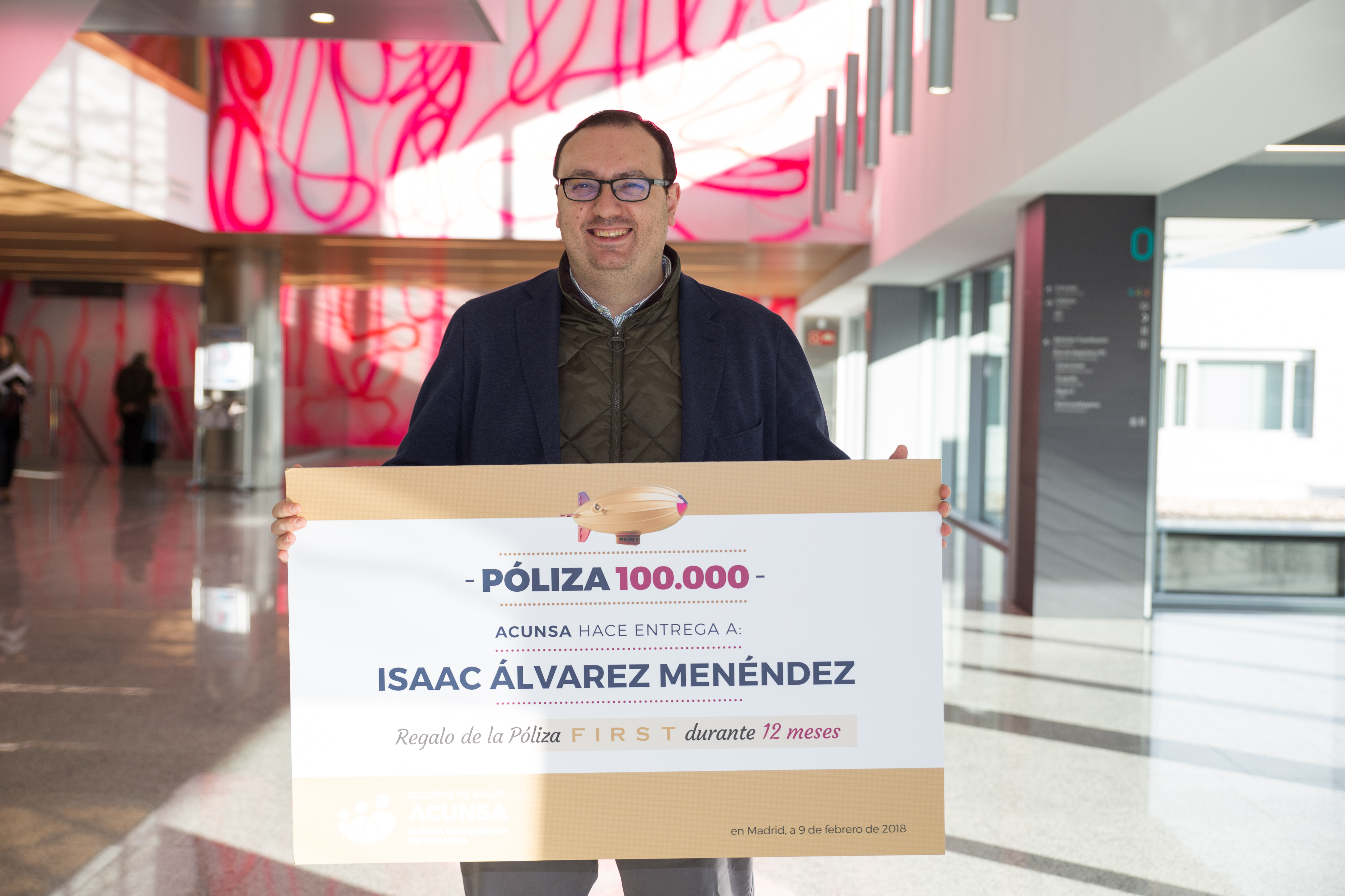 Acunsa ha entregado su póliza número 100.000 al madrileño Isaac Álvarez Menéndez que contrató la póliza Confort en el mes de enero. Además de las coberturas de Confort, Acunsa le ha premiado durante doce meses con las condiciones exclusivas de la póliza Acunsa First. El director territorial de Acunsa en Madrid, Jesús Moreno, hizo entrega a Isaac Álvarez Menéndez de la documentación de su póliza First y del cheque regalo, en las nuevas instalaciones de Clínica Universidad de Navarra en Madrid.