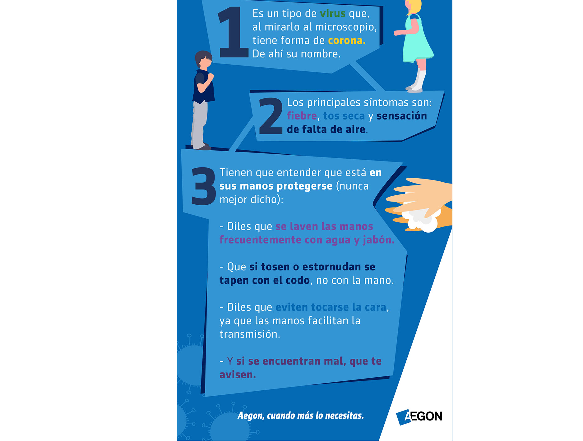 En esta situación en la que la mayoría de las familias se encuentran confinadas en casa con los más pequeños desesperados por salir, desde Aegon dan algunas claves para ayudar a los más pequeños- y no tan pequeños- a entender y asimilar qué es el coronavirus y cómo nos afecta en la vida diaria.
