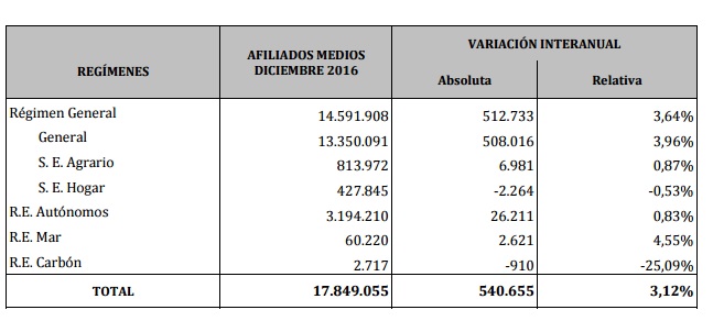 La afiliación a la Seguridad Social crece en 540.655 personas en 2016