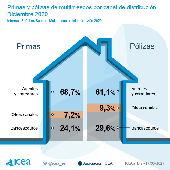 Los datos de ICEA correspondientes al cierre de 2020 sitúan en un 68,7% la cuota de mercado de los agentes y corredores en el total de primas de Multirriesgos. Dejan muy lejos a la bancaseguros, que acaparó el 24,1% de las primas. En cuanto a las pólizas de Multirriesgos, también sigue siendo mayoritaria la participación de los agentes y corredores con el 61,1% del total.