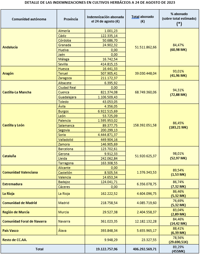 Castilla y León, una de las principales zonas productoras de herbáceos, es la región que más indemnizaciones ha recibido, sumando un total de 158,4 millones. A continuación, Castilla-La Mancha ha recibido 68,7 millones y Cataluña, 51,9 millones.