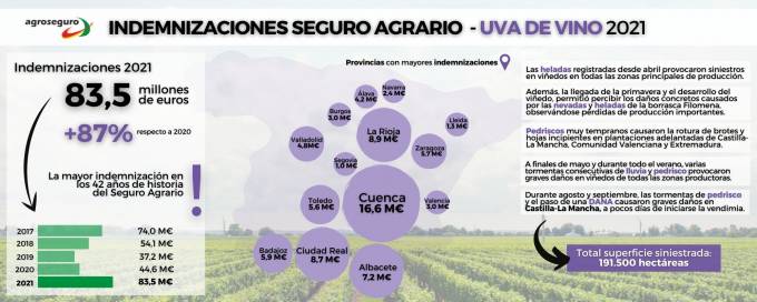 Las indemnizaciones abonadas por Agroseguro a los viticultores por siniestros en 2021 se ha elevado a 83,5 millones de euros, un 87% más que en la cosecha anterior. Las hectáreas siniestradas han sumado 191.000 hectáreas. Apunta Agroseguro que es la cifra más alta en daños en el seguro de uva de vino en los 42 años de historia del sistema español de seguros agrarios.