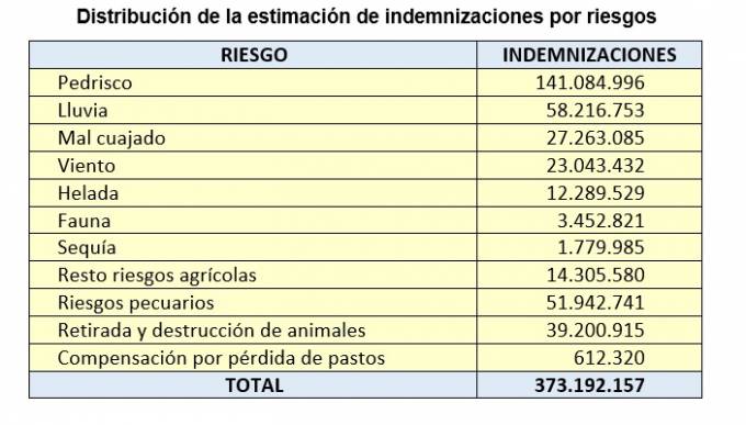 Por riesgos, las tormentas de pedrisco y las intensas precipitaciones son los fenómenos atmosféricos que, en general, han causado más daños en las producciones agrícolas. La estimación de indemnizaciones por pedrisco supone casi el 40% del total, y si sumamos ambos, superan el 50% y prácticamente alcanzan los 200 millones de euros.