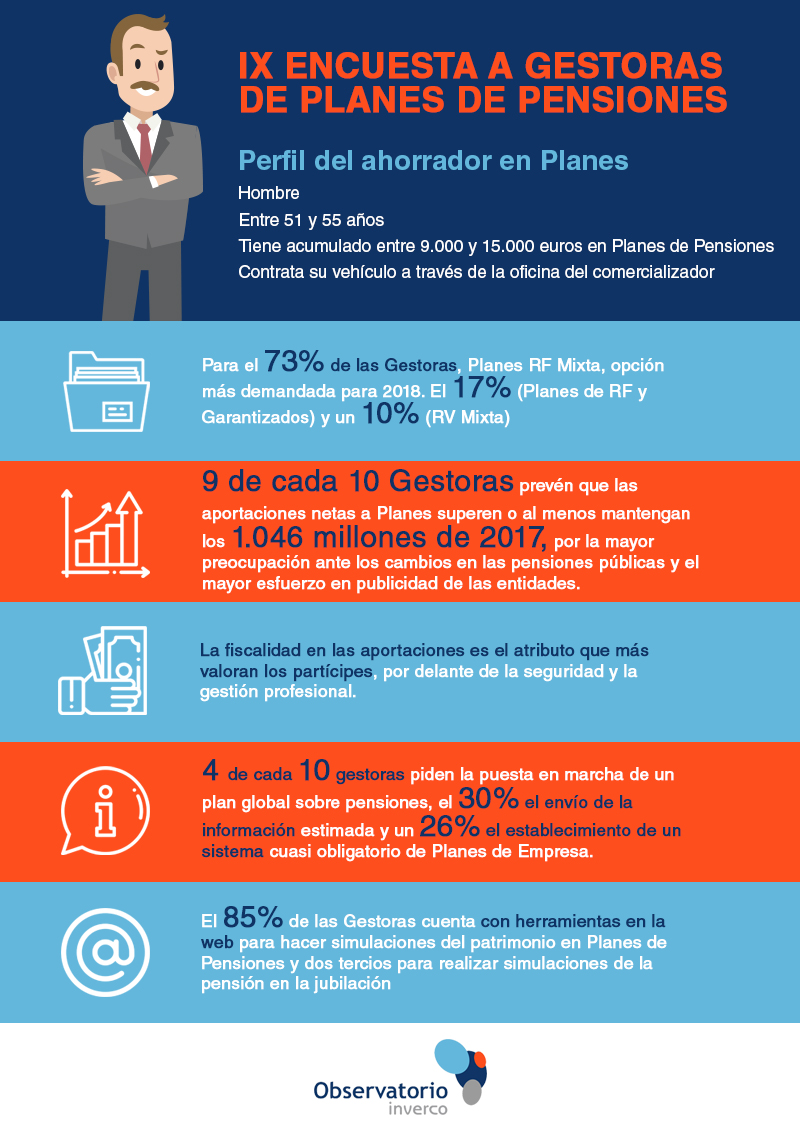 El perfil de ahorrador en Planes de Pensiones según se desprende de la IX Encuesta sobre Planes de Pensiones Individuales elaborada por el Observatorio Inverco corresponde a un hombre (entre el 55% y el 60% del total de partícipes) de entre 51 y 55 años, que tiene acumulado entre 9.000 y 15.000 euros en Planes de Pensiones y contrata su vehículo a través de la oficina del comercializador, antes de hacerlo por la web o por teléfono.