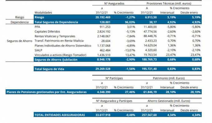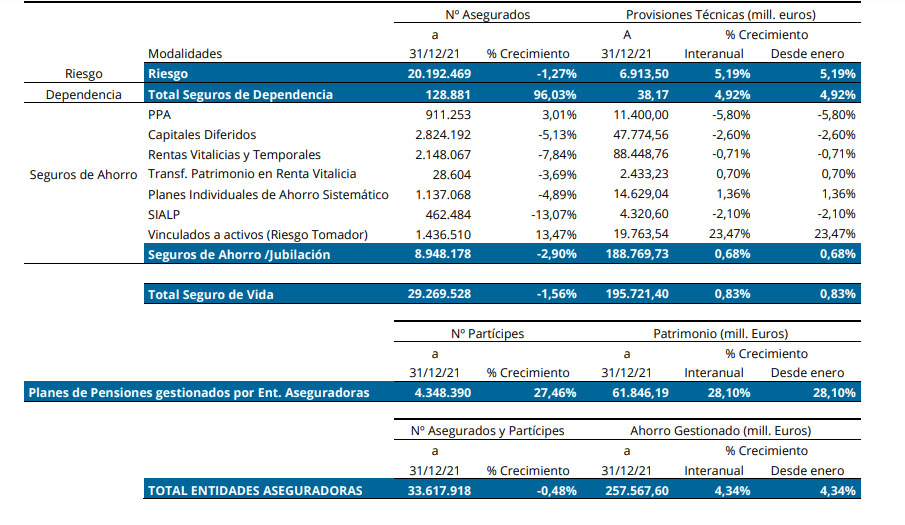 Los seguros de Vida se han mantenido planos con un crecimiento del 0,83% y una suma total de provisiones técnicas de 195.721 millones; el número de asegurados se contrajo en un 1,56% y un total de 29,2 millones.