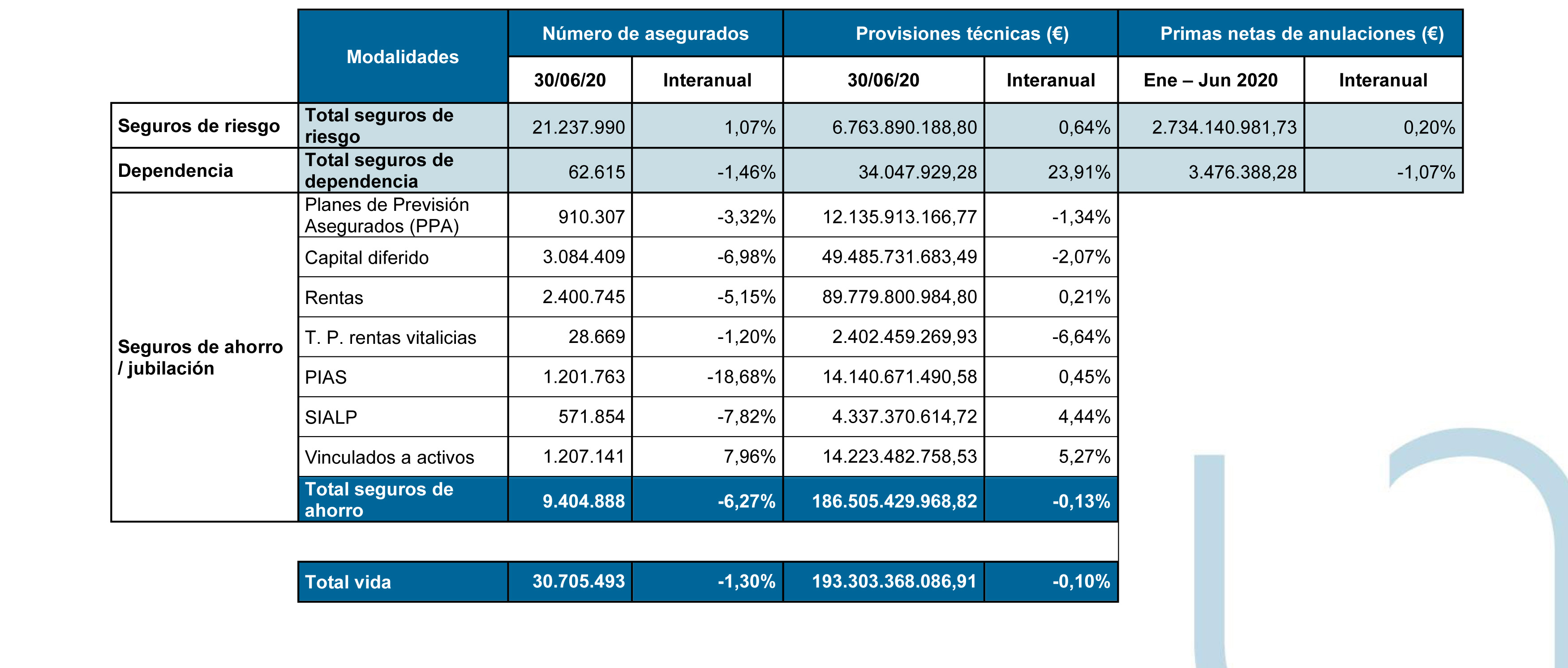 La asociación hace referencia al impacto de la paralización de la actividad económica por la pandemia en la evolución del negocio de Vida. Señala que casi todas las líneas de negocio "han reducido el ahorro bajo gestión desde que comenzó el año. Los descensos más pronunciados en los primeros seis meses se han dado en la transformación de patrimonio en rentas vitalicias (-7,37%), así como en los PIAS (-2,19%). Los SIALP marcan la excepción y se mantienen estables incluso cuando se compara su situación a 30 de junio con la que tenían el pasado 31 de diciembre".